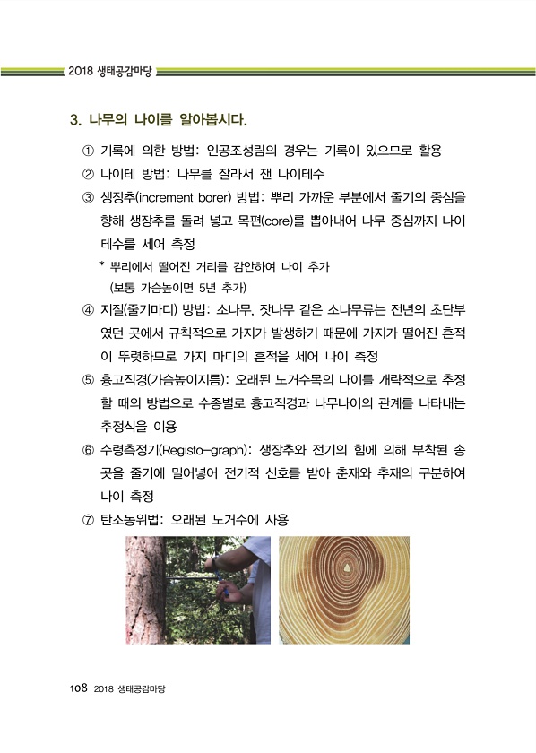 108 2018 생태공감마당 3. 나무의 나이를 알아봅시다. ① 기록에 의한 방법인공조성림의 경우는 기록이 있으므로 활용 ② 나이테 방법나무를 잘라서 잰 나이테수 ③ 생장추 increment borer 방법뿌리 가까운 부분에서 줄기의 중심을 향해 생장추를 돌려 넣고 목편 core 를 뽑아내어 나무 중심까지 나이 테수를 세어 측정 * 뿌리에서 떨어진 거리를 감안하여 나이 추가 보통 가슴높이면 5년 추가 ④ 지절 줄기마디 방법소나무, 잣나무 같은 소나무류는 전년의 초단부 였던 곳에서 규칙적으로 가지가 발생하기 때문에 가지가 떨어진 흔적 이 뚜렷하므로 가지 마디의 흔적을 세어 나이 측정 ⑤ 흉고직경 가슴높이지름 오래된 노거수목의 나이를 개략적으로 추정 할 때의 방법으로 수종별로 흉고직경과 나무나이의 관계를 나타내...