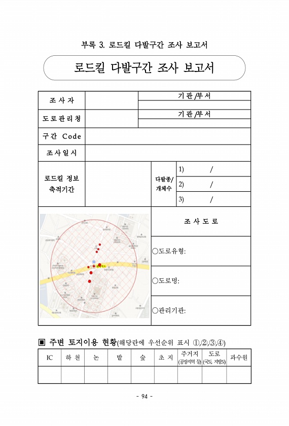 94 부록 3. 로드킬 다발구간 조사 보고서 로드킬 다발구간 조사 보고서 조 사 자 기 관 /부 서 도 로 관 리 청 기 관 /부 서 구 간 C o d e 조 사 일 시 로드킬 정보 축적기간 다발종/ 개체수 1 2 3 조 사 도 로 ○도로유형○도로명○관리기관▣ 주변 토지이용 현황 해당란에 우선순위 표시 ①,②,③,④ IC 하 천 논 밭 숲 초 지 주거지 공장지역 등 도로 국도, 지방도과수원