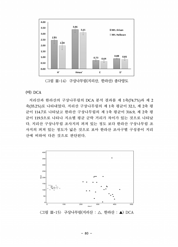 80 그림 Ⅲ-14 구상나무림 지리산, 한라산 종다양도 아 DCA 지리산과 한라산의 구상나무림의 DCA 분석 결과를 제 1축 74.7% 과 제 2 축 35.2% 로 나타내었다. 지리산 구상나무림의 제 1축 평균이 32.1, 제 2축 평 균이 114.7로 나타났고 한라산 구상나무림의 제 1축 평균이 316.9, 제 2축 평 균이 119.5으로 나타나 지소별 평균 군락 거리가 차이가 있는 것으로 나타났 다. 지리산 구상나무림 조사지의 퍼져 있는 정도 보다 한라산 구상나무림 조 사지의 퍼져 있는 정도가 넓은 것으로 보아 한라산 조사구별 구성종이 지리 산에 비하여 다른 것으로 판단된다. 그림 Ⅲ-15 구상나무림 지리산 △, 한라산 ▲DCA