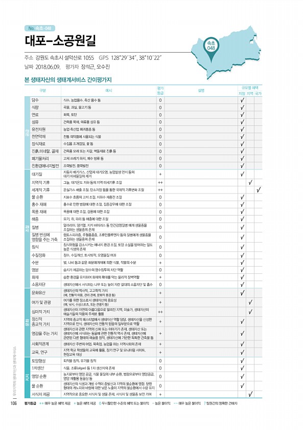 No. 속초- 본 생태자산의 생태계서비스 간이평가지 구분 예시 평가 등급 설명 규모별 혜택 지점 지역 국가 공급 담수 식수, 농업용수, 축산 용수 등 0 √ 식량 곡물, 과실, 물고기 등 0 √ 연료 화목, 토탄 0 √ 섬유 건축용 목재, 의류용 섬유 등 0 √ 유전자원 농업·축산업 희귀품종 등 0 √ 천연약재 전통 의약품에 사용되는 식물 0 √ 장식재료 수집용 조개껍질, 꽃 등 0 √ 진흙,미네랄, 골재 건축용 모래 또는 자갈, 벽돌재료 진흙 등 0 √ 폐기물처리 고체 쓰레기 하치, 폐수 방류 등 0 √ 친환경에너지발전 조력발전, 풍력발전 0 √ 조절 대기질 자동차 배기가스, 산업체 대기오염, 농업발생 먼지 등의 대기 미세물질의 제거 + √ 지역적 기후 그늘, 대기온도 저하 등의 지역 미세기후 조절 ++ ...