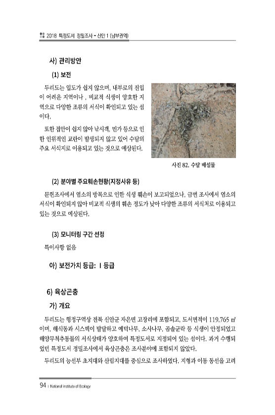 2018 특정도서 정밀조사 신안 1 남부권역 94 ? National Institute of Ecology 1 두리도는 입도가 쉽지 않으며, 내부로의 진입 이 어려운 지역이나 , 비교적 식생이 양호한 지 역으로 다양한 조류의 서식이 확인되고 있는 섬 이다. 또한 접안이 쉽지 않아 낚시객, 민가 등으로 인 한 인위적인 교란이 발생되지 않고 있어 수달의 주요 서식지로 이용되고 있는 것으로 예상된다. 2 문헌조사에서 염소의 방목으로 인한 식생 훼손이 보고되었으나, 금번 조사에서 염소의 서식이 확인되지 않아 비교적 식생의 훼손 정도가 낮아 다양한 조류의 서식처로 이용되고 있는 것으로 예상된다. 3 특이사항 없음 6 두리도는 행정구역상 전북 신안군 자은면 고장리에 포함되고, 도서면적이 119,765 ㎡ 이며, 해식동...