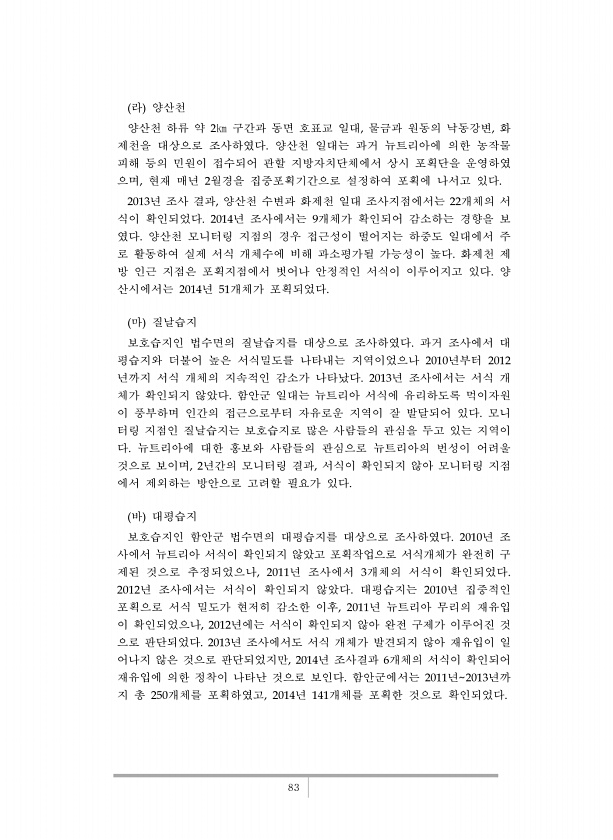83 라 양산천 양산천 하류 약 2㎞ 구간과 동면 호표교 일대, 물금과 원동의 낙동강변, 화 제천을 대상으로 조사하였다. 양산천 일대는 과거 뉴트리아에 의한 농작물 피해 등의 민원이 접수되어 관할 지방자치단체에서 상시 포획단을 운영하였 으며, 현재 매년 2월경을 집중포획기간으로 설정하여 포획에 나서고 있다. 2013년 조사 결과, 양산천 수변과 화제천 일대 조사지점에서는 22개체의 서 식이 확인되었다. 2014년 조사에서는 9개체가 확인되어 감소하는 경향을 보 였다. 양산천 모니터링 지점의 경우 접근성이 떨어지는 하중도 일대에서 주 로 활동하여 실제 서식 개체수에 비해 과소평가될 가능성이 높다. 화제천 제 방 인근 지점은 포획지점에서 벗어나 안정적인 서식이 이루어지고 있다. 양 산시에서는 2014년 51개체...