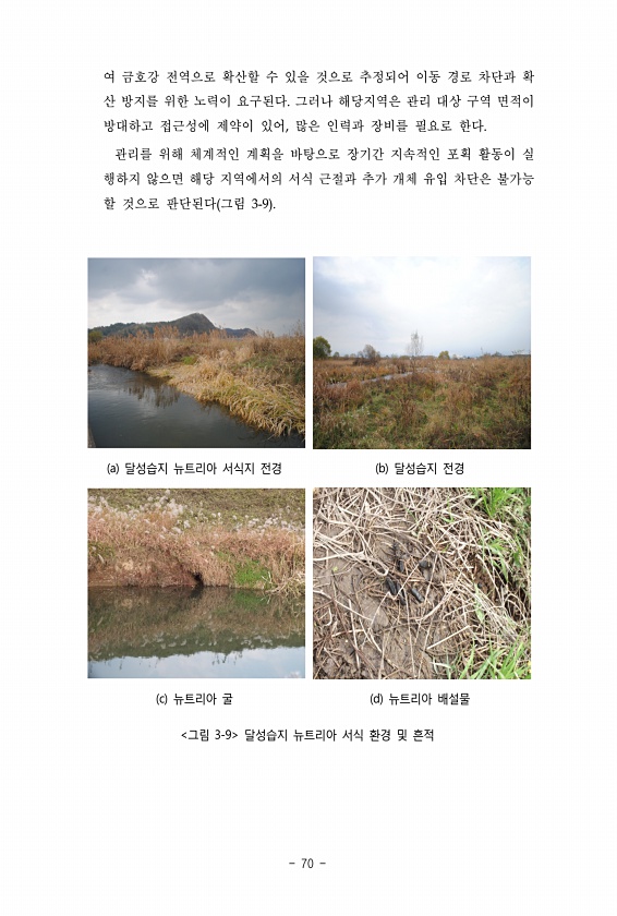 여 금호강 전역으로 확산할 수 있을 것으로 추정되어 이동 경로 차단과 확 산 방지를 위한 노력이 요구된다. 그러나 해당지역은 관리 대상 구역 면적이 방대하고 접근성에 제약이 있어, 많은 인력과 장비를 필요로 한다. 관리를 위해 체계적인 계획을 바탕으로 장기간 지속적인 포획 활동이 실 행하지 않으면 해당 지역에서의 서식 근절과 추가 개체 유입 차단은 불가능 할 것으로 판단된다 그림 3-9 ?? ? ? ? ?? ? ? ? ? ?? ? ??