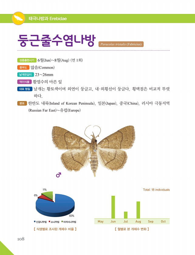 108 태극나방과 Erebidae 성충출현시기 6월 Jun 8월 Aug 연 1회 풍부도 많음 Common 날개편길이 2326mm 먹이식물 활엽수의 마른 잎 대표 형질 날개는 황토색이며 외연이 둥글고, 내·외횡선이 둥글다. 횡맥점은 비교적 뚜렷 하다. 분포 한반도 내륙 Inland of Korean Peninsula , 일본 Japan , 중국 China , 러시아 극동지역 Russian Far East 유럽 Europe 둥근줄수염나방 Paracolax tristalis Fabricius 【 식생별로 조사된 개체수 비율 】 6% 신갈나무림 소나무림 아까시나무림 11% 83% 【 월별로 본 개체수 변화 】 Total18 individuals May Jun Jul Aug SepOct