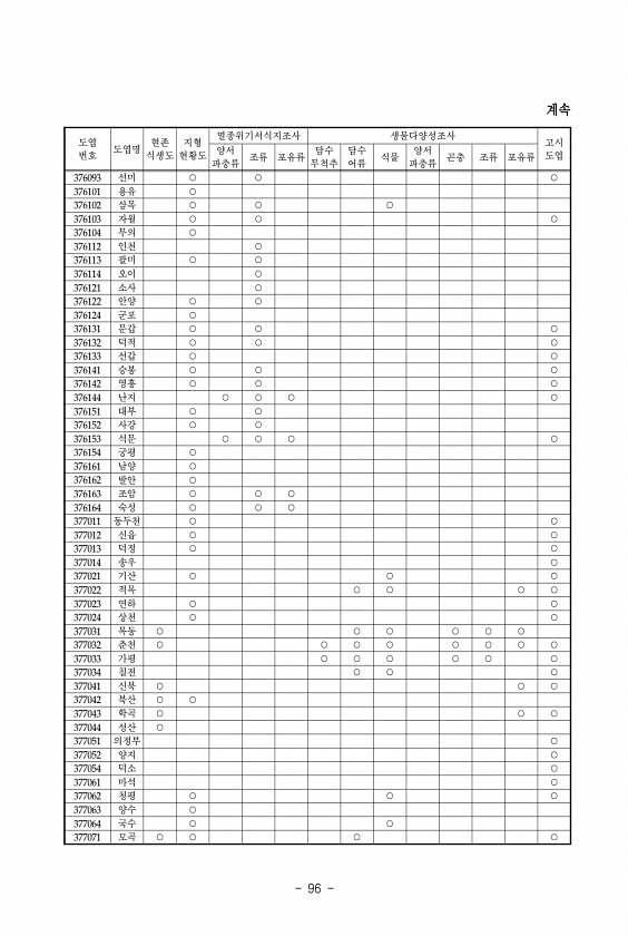 96 도엽 번호 도엽명 식생도 현존 현황도 지형 양서 멸종위기서식지조사 생물다양성조사 고시 도엽 파충류 조류 포유류 무척추 담수 담수 어류 식물 파충류 양서 곤충 조류 포유류 376093 선미 ○ ○ ○ 376101 용유 ○ 376102 삼목 ○ ○ ○ 376103 자월 ○ ○ ○ 376104 무의 ○ 376112 인천 ○ 376113 팔미 ○ ○ 376114 오이 ○ 376121 소사 ○ 376122 안양 ○ ○ 376124 군포 ○ 376131 문갑 ○ ○ ○ 376132 덕적 ○ ○ ○ 376133 선갑 ○ ○ 376141 승봉 ○ ○ ○ 376142 영흥 ○ ○ ○ 376144 난지 ○ ○ ○ ○ 376151 대부 ○ ○ 376152 사강 ○ ○ 376153 석문 ○ ○ ○ ○ 376154 궁평 ○ ...
