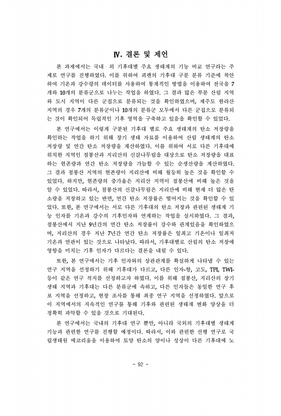 92 결론 및 제언 본 과제에서는 국내?외 기후대별 주요 생태계의 기능 비교 연구라는 주 제로 연구를 진행하였다 이를 위하여 쾨펜의 기후대 구분 분류 기준에 착안 하여 기온과 강수량의 데이터를 사용하여 통계적인 방법을 이용하여 전국을 개와 개의 분류군으로 나누는 작업을 하였다 그 결과 많은 부분 산림 지역 와 도시 지역이 다른 군집으로 분류되는 것을 확인하였으며 제주도 한라산 지역의 경우 개의 분류군이나 개의 분류군 모두에서 다른 군집으로 분류되 는 것이 확인되어 독립적인 기후 영역을 구축하고 있음을 확인할 수 있었다 본 연구에서는 이렇게 구분된 기후대 별로 주요 생태계의 탄소 저장량을 확인하는 작업을 하기 위해 장기 생태 자료를 이용하여 산림 생태계의 탄소 저장량 및 연간 탄소 저장량을 계산하였다 이를 위...