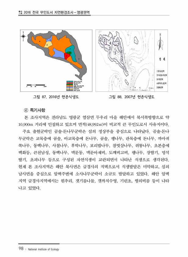 2016 전국 무인도서 자연환경조사 영광권역 98 ? National Institute of Ecology 그림 87. 2016년 현존식생도 그림 88. 2007년 현존식생도 ④ 특기사항 본 조사지역은 전라남도 영광군 염삼면 두우리 마을 해안에서 북서쪽방향으로 약 10,900m 거리에 인접하고 있으며 면적 48,992㎡ 이 비교적 큰 무인도로서 사유지이다. 주요 출현군락인 곰솔-돈나무군락은 섬의 정상부을 중심으로 나타났다. 곰솔-돈나 무군락은 교목층에 곰솔, 아교목층에 돈나무, 곰솔, 팽나무, 관목층에 돈나무, 까마귀 쪽나무, 동백나무, 사철나무, 후박나무, 보리밥나무, 참빗살나무, 쥐똥나무, 초본층에 백화등, 큰천남성, 동백나무, 맥문동, 맥문아재비, 도깨비고비, 팽나무, 장딸기, 멍석 딸기, 초피나무 등...