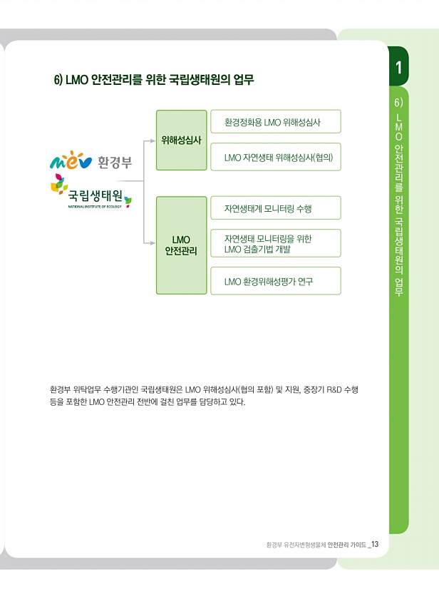 1 환경부 유전자변형생물체 안전관리 가이드 _13 6 L M O 안전관리를 위한 국립생태원의 업무 6 LMO 안전관리를 위한 국립생태원의 업무 환경부 위탁업무 수행기관인 국립생태원은 LMO 위해성심사 협의 포함 및 지원, 중장기 R&D 수행 등을 포함한 LMO 안전관리 전반에 걸친 업무를 담당하고 있다. 환경정화용 LMO 위해성심사 위해성심사 LMO 안전관리 자연생태계 모니터링 수행 LMO 자연생태 위해성심사 협의 자연생태 모니터링을 위한 LMO 검출기법 개발 LMO 환경위해성평가연구