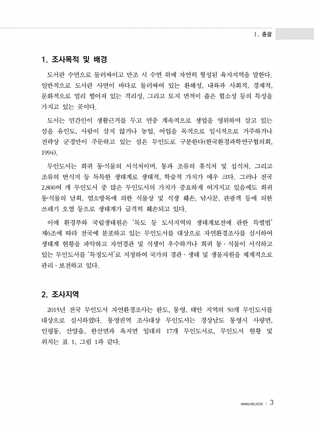 Ⅰ. 총괄 www.nie.re.kr ? 3 1. 조사목적 및 배경 도서란 수면으로 둘러싸이고 만조 시 수면 위에 자연히 형성된 육지지역을 말한다. 일반적으로 도서란 사면이 바다로 둘러싸여 있는 환해성, 내륙과 사회적, 경제적, 문화적으로 멀리 떨어져 있는 격리성, 그리고 토지 면적이 좁은 협소성 등의 특성을 가지고 있는 곳이다. 도서는 민간인이 생활근거를 두고 연중 계속적으로 생업을 영위하며 살고 있는 섬을 유인도, 사람이 살지 않거나 농업, 어업을 목적으로 일시적으로 거주하거나 전략상 군경만이 주둔하고 있는 섬은 무인도로 구분한다 한국환경과학연구협의회, 1994 무인도서는 희귀 동?식물의 서식처이며, 통과 조류의 휴식처 및 섭식처, 그리고 조류의 번식지 등 독특한 생태계로 생태적, 학술적 가치가 매우 크다...