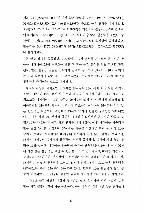결과, 23시 88.57±10.30SD 에 가장 높은 활력을 보였고, 19시 79.16±56.74SD , 02시 73.67±48.81SD , 22시 60.45±42.89SD 순으로 높은 활력을 나타내었다. 05시 55.38±78.51SD , 06시 23.54±25.92SD 를 기점으로 활동이 급격히 감소하 여 09시 4.58±9.48SD 와 10시 4.93±7.32SD 에 가장 낮은 활동력을 보였다. 주 간에는 13시 39.02±41.94SD 와 15시 46.03±21.07SD 에 움직임이 증가하였고, 활동력은 24시 47.73±26.66SD 와 03시 45.13±26.69SD , 05시 45.02±31.78SD 와 유사하였다. 본 연구 결과를 종합하면, 뉴트리아는 17시 전후를 기점으로 본격적인 활 동을 ...