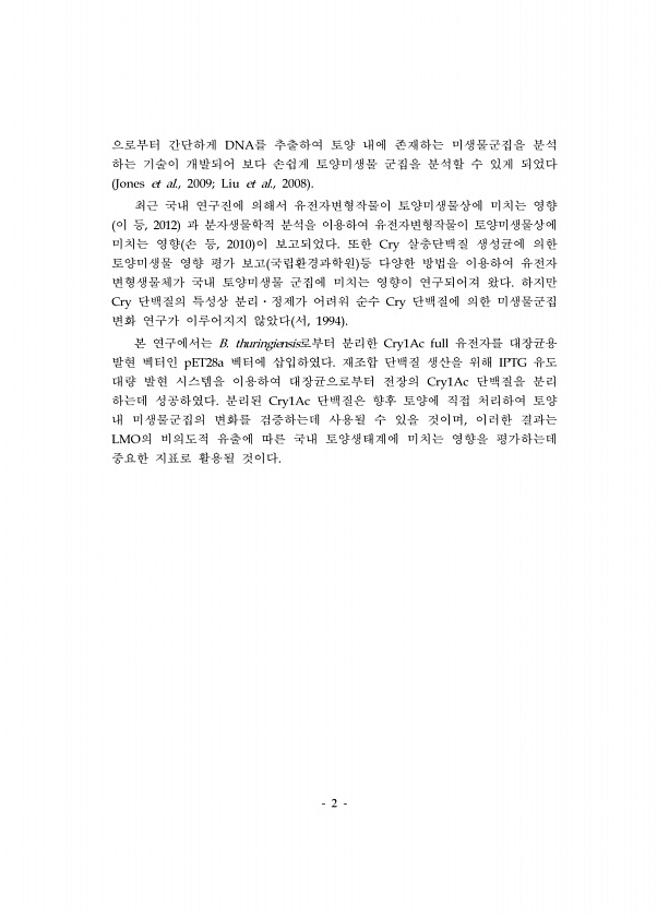 2 으로부터 간단하게 DNA를 추출하여 토양 내에 존재하는 미생물군집을 분석 하는 기술이 개발되어 보다 손쉽게 토양미생물 군집을 분석할 수 있게 되었다 Jones et al., 2009; Liu et al., 2008 최근 국내 연구진에 의해서 유전자변형작물이 토양미생물상에 미치는 영향 이 등, 2012 과 분자생물학적 분석을 이용하여 유전자변형작물이 토양미생물상에 미치는 영향 손 등, 2010 이 보고되었다. 또한 Cry 살충단백질 생성균에 의한 토양미생물 영향 평가 보고 국립환경과학원 등 다양한 방법을 이용하여 유전자 변형생물체가 국내 토양미생물 군집에 미치는 영향이 연구되어져 왔다. 하지만 Cry 단백질의 특성상 분리ㆍ정제가 어려워 순수 Cry 단백질에 의한 미생물군집 변화 연구가 이루어지지 않았다 서...