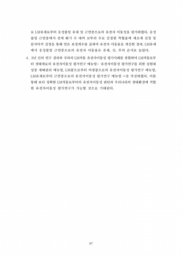 97 로 LM유채로부터 웅성불임 유채 및 근연종으로의 유전자 이동성을 평가하였다. 웅성 불임 근연종에서 전체 화기 수 대비 꼬투리 수로 산정한 착협율에 제초제 검정 및 분자마커 검정을 통해 얻은 보정계수를 곱하여 유전자 이동율을 계산한 결과, LM유채 에서 웅성불임 근연종으로의 유전자 이동율은 유채, 갓, 무의 순서로 높았다. 4. 3년 간의 연구 결과와 국외의 LM작물 유전자이동성 평가사례를 종합하여 LM작물로부 터 생태계로의 유전자이동성 평가연구 매뉴얼- 유전자이동성 평가연구를 위한 실험대 상종 재배관리 매뉴얼, LM콩으로부터 야생콩으로의 유전자이동성 평가연구 매뉴얼, LM유채로부터 근연종으로의 유전자이동성 평가연구 매뉴얼 -을 작성하였다. 이를 통해 보다 정확한 LM작물로부터의 유전자이동성 판단과 우리...