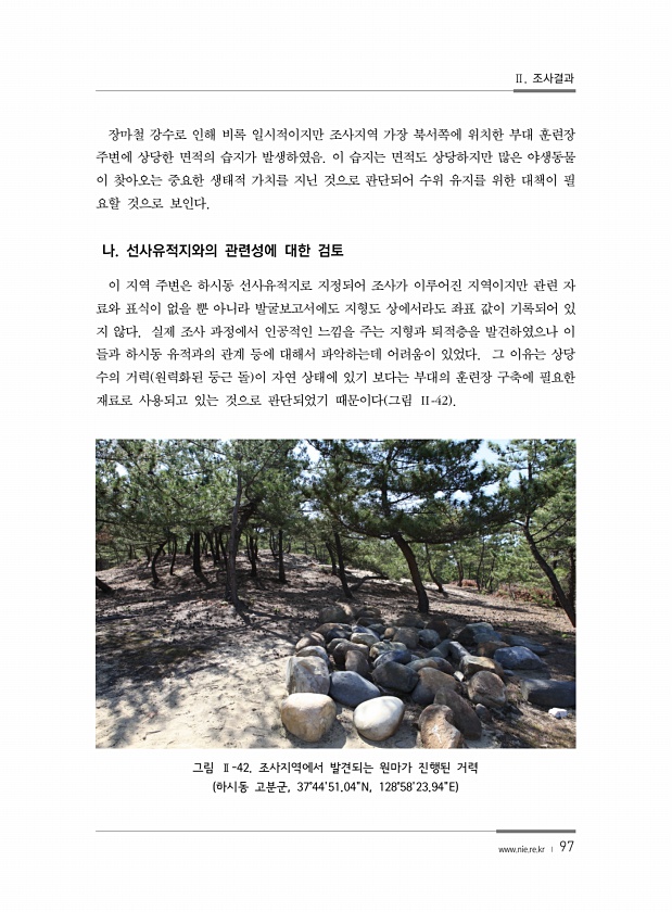Ⅱ. 조사결과 www.nie.re.kr ? 97 장마철 강수로 인해 비록 일시적이지만 조사지역 가장 북서쪽에 위치한 부대 훈련장 주변에 상당한 면적의 습지가 발생하였음. 이 습지는 면적도 상당하지만 많은 야생동물 이 찾아오는 중요한 생태적 가치를 지닌 것으로 판단되어 수위 유지를 위한 대책이 필 요할 것으로 보인다. 나. 선사유적지와의 관련성에 대한 검토 이 지역 주변은 하시동 선사유적지로 지정되어 조사가 이루어진 지역이지만 관련 자 료와 표식이 없을 뿐 아니라 발굴보고서에도 지형도 상에서라도 좌표 값이 기록되어 있 지 않다. 실제 조사 과정에서 인공적인 느낌을 주는 지형과 퇴적층을 발견하였으나 이 들과 하시동 유적과의 관계 등에 대해서 파악하는데 어려움이 있었다. 그 이유는 상당 수의 거력 원력화된 둥근 ...