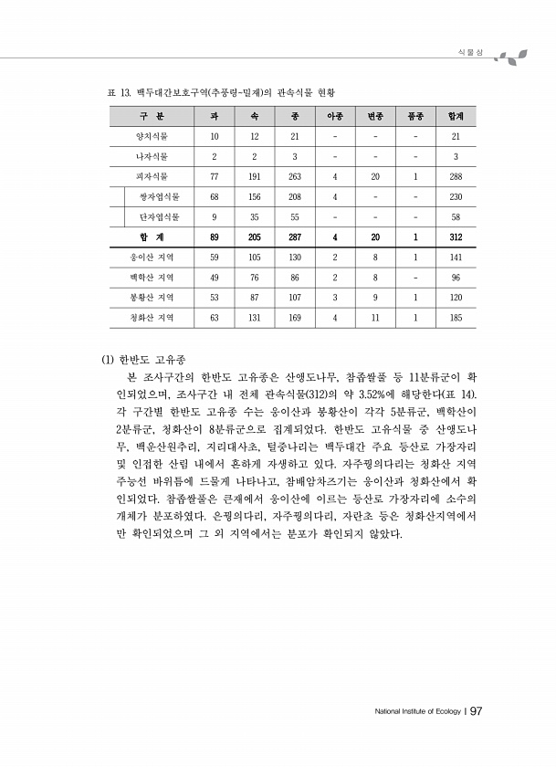 식 물 상 National Institute of EcologyⅠ97 표 13. 백두대간보호구역 추풍령밀재 의 관속식물 현황 구 분 과 속 종 아종 변종 품종 합계 양치식물 10 12 21 21 나자식물 2 2 3 3 피자식물 77 191 263 4 20 1 288 쌍자엽식물 68 156 208 4 230 단자엽식물 9 35 55 58 합 계 89 205 287 4 20 1 312 웅이산 지역 59 105 130 2 8 1 141 백학산 지역 49 76 86 2 8 96 봉황산 지역 53 87 107 3 9 1 120 청화산 지역 63 131 169 4 11 1 185 1 한반도 고유종 본 조사구간의 한반도 고유종은 산앵도나무, 참좁쌀풀 등 11분류군이 확 인되었으며, 조사구간 내 전체 관속식물 312 의 ...