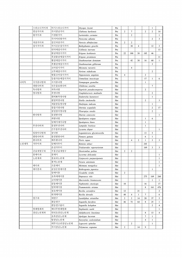 스라소니거미과 아기스라소니거미 Oxyopes licenti Pre 1 염낭거미과 각시염낭거미 Clubiona kurilensis Pre 2 7 2 2 14 왕거미과 기생왕거미 Larinioides cornutus Pre 2 1 각시어리왕거미 Neoscona adianta Pre 2 3 자갈거미과 살깃자갈거미 Nurscia albofasciata Pre 2 2 접시거미과 각시긴손접시거미 Bathyphantes gracilis Pre 30 4 12 3 언덕애접시거미 Collinsia inerrans Pre 13 톱날애접시거미 Erigone koshiensis Pre 22 100 38 185 46 흑갈톱날애접시거미 Erigone prominens Pre 11 황갈애접시거미 Gnathonarium dentatum ...