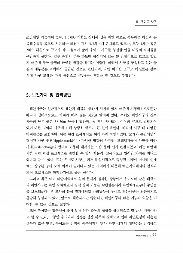Ⅱ. 우이도 사구 www.nie.re.kr ? 97 조간대일 가능성이 높다. 15,000 지형도 상에서 성촌 해안 쪽으로 북류하는 하천과 돈 목해수욕장 쪽으로 서류하는 하천이 각각 3개와 4개 존재하고 있으나, 모두 1차수 혹은 2차수 하천으로 규모가 작고 유로가 짧아 우이도 사구를 형성할 만큼 대량의 퇴적물을 운반하지 못한다. 일부 하천의 경우 하도만 형성되어 있을 뿐 간헐적으로 흐르고 있었 기 때문에 사구 물질의 공급원 역할을 하기는 어렵다. 따라서 사구를 구성하고 있는 물 질의 대부분은 외해에서 공급된 것으로 판단되며, 다만 이러한 소규모 하천들은 강우 시에 사구 모래를 다시 해안으로 운반하는 역할을 할 것으로 추정된다. 5. 보전가치 및 관리방안 해안사구는 일반적으로 해안과 내륙의 중간에 위치해 있기...