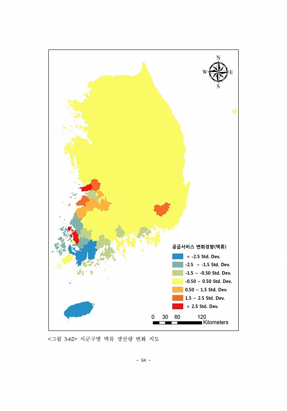 94 그림 3-62 시군구별 맥류 생산량 변화지도