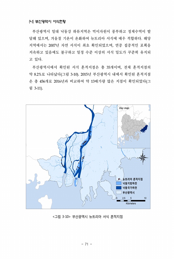 ? ? 부산광역시 일대 낙동강 하류지역은 먹이자원이 풍부하고 정체수역이 발 달해 있으며, 겨울철 기온이 온화하여 뉴트리아 서식에 매우 적합하다. 해당 지역에서는 2007년 자연 서식이 최초 확인되었으며, 연중 집중적인 포획을 지속하고 있음에도 불구하고 일정 수준 이상의 서식 밀도가 꾸준히 유지되 고 있다. 부산광역시에서 확인된 서식 흔적지점은 총 35개이며, 전체 흔적지점의 약 8.2%로 나타났다 그림 3-10 2015년 부산광역시 내에서 확인된 흔적지점 은 총 456개로 2016년과 비교하여 약 13배가량 많은 지점이 확인되었다 그 림 3-11 ? ? ? ? ?? ?