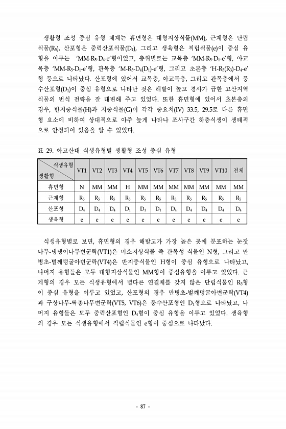 87 생활형 조성 중심 유형 체계는 휴면형은 대형지상식물 MM , 근계형은 단립 식물 R5 , 산포형은 중력산포식물 D4 , 그리고 생육형은 직립식물 e 이 중심 유 형을 이루는 ‘MM-R5-D4-e’형이었고, 층위별로는 교목층 ‘MM-R5-D1-e’형, 아교 목층 ‘MM-R5-D1-e’형, 관목층 ‘M-R5-D4 D1 -e’형, 그리고 초본층 ‘H-R5 R3 -D4-e’ 형 등으로 나타났다. 산포형에 있어서 교목층, 아교목층, 그리고 관목층에서 풍 수산포형 D1 이 중심 유형으로 나타난 것은 해발이 높고 경사가 급한 고산지역 식물의 번식 전략을 잘 대변해 주고 있었다. 또한 휴면형에 있어서 초본층의 경우, 반지중식물 H 과 지중식물 G 이 각각 중요치 IV 33.5, 29.5로 다른 휴면 형 요소에 비하여...