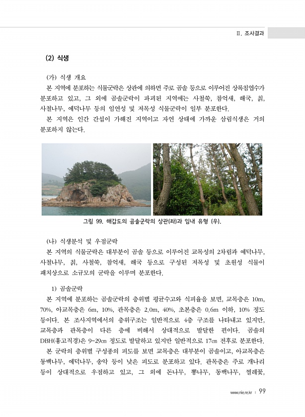 Ⅱ. 조사결과 www.nie.re.kr ? 99 2 식생 가 식생 개요 본 지역에 분포하는 식물군락은 상관에 의하면 주로 곰솔 등으로 이루어진 상록침엽수가 분포하고 있고, 그 외에 곰솔군락이 파괴된 지역에는 사철쑥, 참억새, 해국, 칡, 사철나무, 예덕나무 등의 임연성 및 저목성 식물군락이 일부 분포한다. 본 지역은 인간 간섭이 가해진 지역이고 자연 상태에 가까운 삼림식생은 거의 분포하지 않는다. 그림 99. 해갑도의 곰솔군락의 상관 좌 과 임내 유형 우 나 식생분석 및 우점군락 본 지역의 식물군락은 대부분이 곰솔 등으로 이루어진 교목성의 2차림과 예덕나무, 사철나무, 칡, 사철쑥, 참억새, 해국 등으로 구성된 저목성 및 초원성 식물이 패치상으로 소규모의 군락을 이루며 분포한다. 1 곰솔군락 본 지역에 분포...
