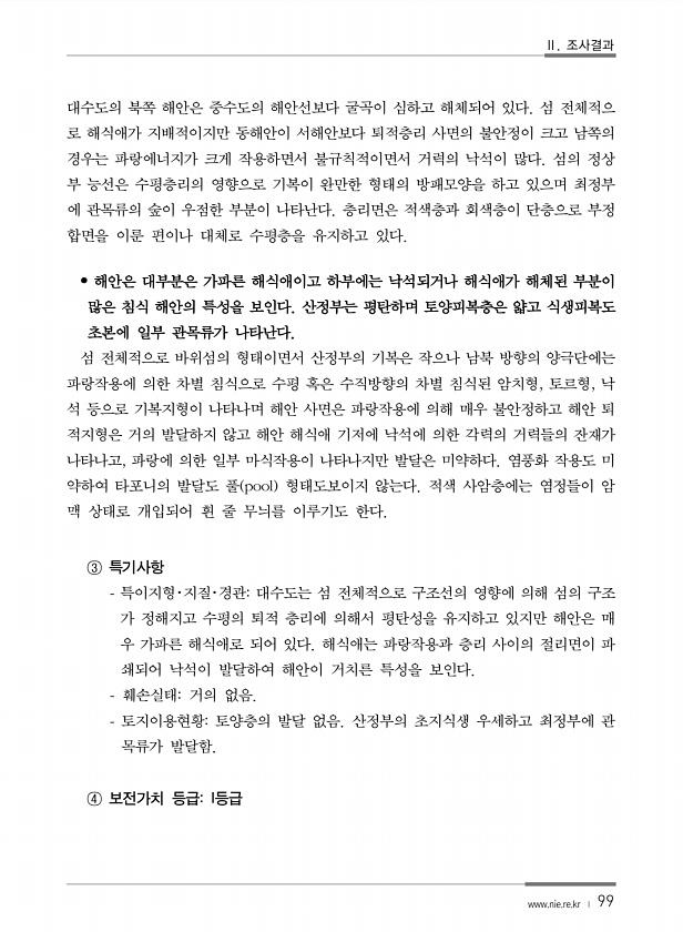 Ⅱ. 조사결과 www.nie.re.kr ? 99 대수도의 북쪽 해안은 중수도의 해안선보다 굴곡이 심하고 해체되어 있다. 섬 전체적으 로 해식애가 지배적이지만 동해안이 서해안보다 퇴적층리 사면의 불안정이 크고 남쪽의 경우는 파랑에너지가 크게 작용하면서 불규칙적이면서 거력의 낙석이 많다. 섬의 정상 부 능선은 수평층리의 영향으로 기복이 완만한 형태의 방패모양을 하고 있으며 최정부 에 관목류의 숲이 우점한 부분이 나타난다. 층리면은 적색층과 회색층이 단층으로 부정 합면을 이룬 편이나 대체로 수평층을 유지하고 있다. ? 해안은 대부분은 가파른 해식애이고 하부에는 낙석되거나 해식애가 해체된 부분이 많은 침식 해안의 특성을 보인다. 산정부는 평탄하며 토양피복층은 얇고 식생피복도 초본에 일부 관목류가 나타난다. 섬 전체...