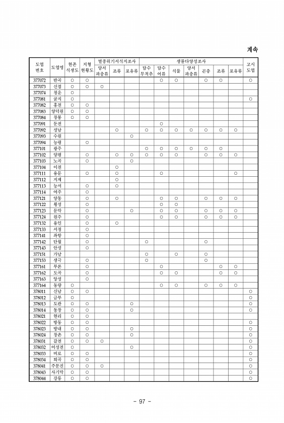 97 도엽 번호 도엽명 식생도 현존 현황도 지형 양서 멸종위기서식지조사 생물다양성조사 고시 도엽 파충류 조류 포유류 무척추 담수 담수 어류 식물 파충류 양서 곤충 조류 포유류 377072 반곡 ○ ○ ○ ○ ○ ○ ○ 377073 신점 ○ ○ ○ 377074 청운 ○ 377081 굴지 ○ ○ 377082 홍천 ○ ○ 377083 양덕원 ○ ○ 377084 창봉 ○ ○ 377091 둔전 ○ 377092 성남 ○ ○ ○ ○ ○ ○ ○ ○ 377093 수원 ○ 377094 능평 ○ 377101 광주 ○ ○ ○ ○ ○ ○ 377102 양평 ○ ○ ○ ○ ○ ○ ○ ○ ○ 377103 노곡 ○ ○ 377104 이천 ○ 377111 용문 ○ ○ ○ ○ 377112 지제 ○ 377113 능서 ○ ○ 377114 여주 ○...