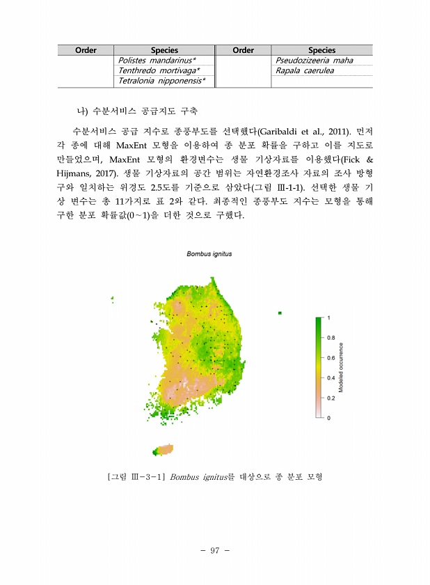 97 Order Species Order Species Polistes mandarinus* Pseudozizeeria maha Tenthredo mortivaga* Rapala caerulea Tetralonia nipponensis* 나 수분서비스 공급지도 구축 수분서비스 공급 지수로 종풍부도를 선택했다 Garibaldi et al., 2011 먼저 각 종에 대해 MaxEnt 모형을 이용하여 종 분포 확률을 구하고 이를 지도로 만들었으며, MaxEnt 모형의 환경변수는 생물 기상자료를 이용했다 Fick & Hijmans, 2017 생물 기상자료의 공간 범위는 자연환경조사 자료의 조사 방형 구와 일치하는 위경도 2.5도를 기준으로 삼았다 그림 Ⅲ-1-1 선택한 생물 기 상 변수는 총 11가지로 표 2와 같...