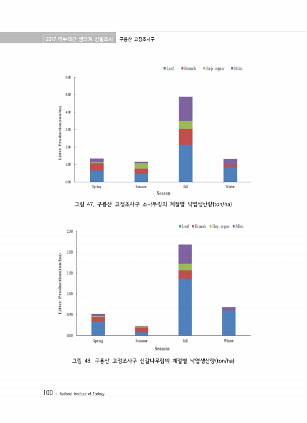 2017 백두대간 생태계 정밀조사 구룡산 고정조사구 100 ? National Institute of Ecology 그림 47. 구룡산 고정조사구 소나무림의 계절별 낙엽생산량 ton/ha 그림 48. 구룡산 고정조사구 신갈나무림의 계절별 낙엽생산량 ton/ha