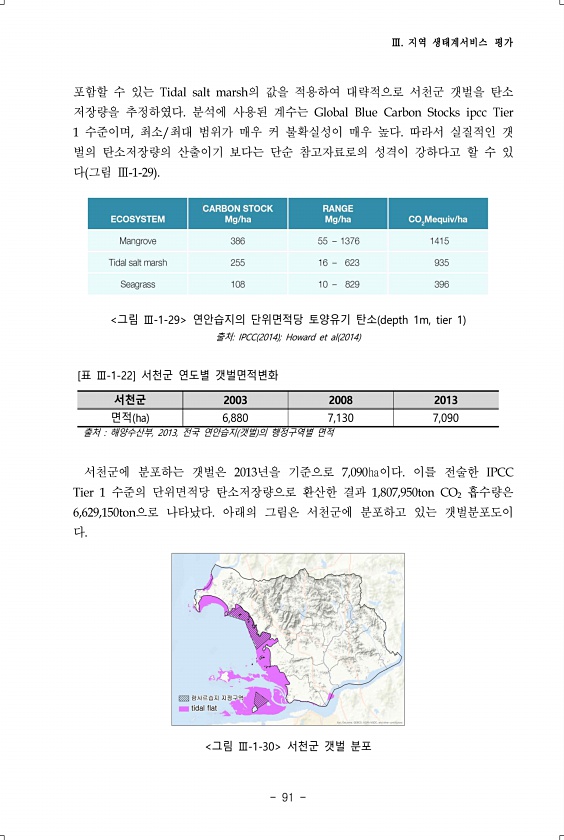 Ⅲ. 지역 생태계서비스 평가 91 포함할 수 있는 Tidal salt marsh의 값을 적용하여 대략적으로 서천군 갯벌을 탄소 저장량을 추정하였다. 분석에 사용된 계수는 Global Blue Carbon Stocks ipcc Tier 1 수준이며, 최소/최대 범위가 매우 커 불확실성이 매우 높다. 따라서 실질적인 갯 벌의 탄소저장량의 산출이기 보다는 단순 참고자료로의 성격이 강하다고 할 수 있 다 그림 Ⅲ-1-29 그림 Ⅲ-1-29 연안습지의 단위면적당 토양유기 탄소 depth 1m, tier 1 출처IPCC 2014 ; Howard et al 2014 서천군 2003 2008 2013 면적 ㏊ 6,880 7,130 7,090 출처 해양수산부, 2013, 전국 연안습지 갯벌 의 행정구역별 면적 [표 Ⅲ-1-...