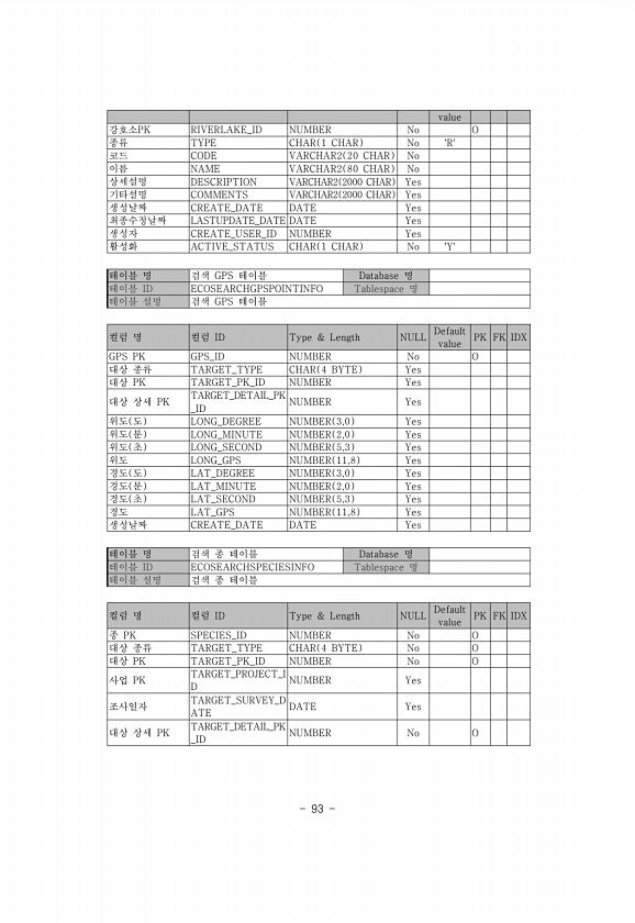 93 value 강호소PK RIVERLAKE_ID NUMBER No O 종류 TYPE CHAR 1 CHAR No R코드 CODE VARCHAR2 20 CHAR No 이름 NAME VARCHAR2 80 CHAR No 상세설명 DESCRIPTION VARCHAR2 2000 CHAR Yes 기타설명 COMMENTS VARCHAR2 2000 CHAR Yes 생성날짜 CREATE_DATE DATE Yes 최종수정날짜 LASTUPDATE_DATE DATE Yes 생성자 CREATE_USER_ID NUMBER Yes 활성화 ACTIVE_STATUS CHAR 1 CHAR No Y테이블 명 검색 GPS 테이블 Database 명 테이블 ID ECOSEARCHGPSPOINTINFO Tablespace 명 테이블 설명 검색 G...
