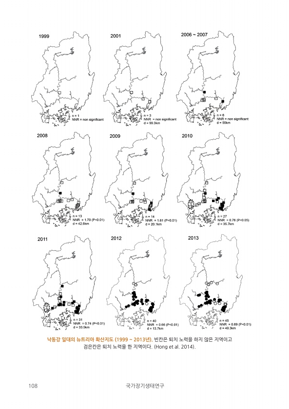 108 국가장기생태연구 낙동강 일대의 뉴트리아 확산지도 1999 2013년 빈칸은 퇴치 노력을 하지 않은 지역이고 검은칸은 퇴치 노력을 한 지역이다. Hong et al. 2014