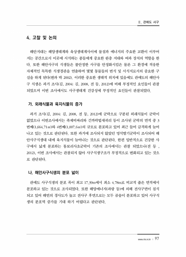 Ⅱ. 관매도 사구 www.nie.re.kr ? 97 4. 고찰 및 논의 해안지대는 해양생태계와 육상생태계사이에 물질과 에너지의 주요한 교환이 이루어 지는 공간으로서 이곳에 서식하는 종들에게 중요한 완충 지대와 여과 장치의 역할을 한 다. 또한 해안사구의 식생들은 불안정한 사구를 안정화시킴은 물론 그 환경에 적응한 자체적인 독특한 식생경관을 연출하며 몇몇 동물들의 번식 및 서식지로서의 중요한 구 실을 하게 된다 변과 박 2002 이러한 중요한 생태적 위치에 있음에도 관매도의 해안사 구 식생은 과거 조사 김, 2004; 김, 2008, 전 등, 2012 에 비해 부정적인 요인들이 관찰 되었으며 이번 조사에서도 사구생태계 건강성에 부정적인 요인들이 관찰되었다. 가. 외래식물과 육지식물의 증가 과거 조사 김, 20...