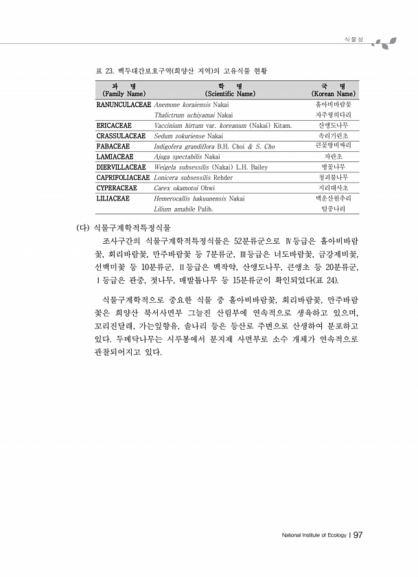 식 물 상 National Institute of EcologyⅠ97 과 명 Family Name 학 명 Scientific Name 국 명 Korean Name RANUNCULACEAE Anemone koraiensis Nakai 홀아비바람꽃 Thalictrum uchiyamai Nakai 자주꿩의다리 ERICACEAE Vaccinium hirtum var. koreanum Nakai Kitam. 산앵도나무 CRASSULACEAE Sedum zokuriense Nakai 속리기린초 FABACEAE Indigofera grandiflora B.H. Choi & S. Cho 큰꽃땅비싸리 LAMIACEAE A juga spectabilis Nakai 자란초 DIERVILLACEAE Weigela subsessi...