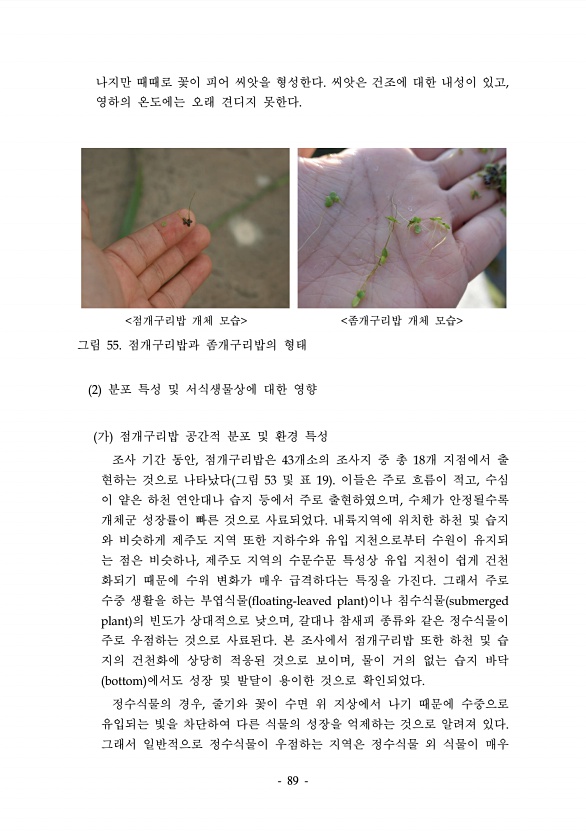 89 나지만 때때로 꽃이 피어 씨앗을 형성한다. 씨앗은 건조에 대한 내성이 있고, 영하의 온도에는 오래 견디지 못한다. 점개구리밥 개체 모습 좀개구리밥 개체 모습 그림 55. 점개구리밥과 좀개구리밥의 형태 2 분포 특성 및 서식생물상에 대한 영향 가 점개구리밥 공간적 분포 및 환경 특성 조사 기간 동안, 점개구리밥은 43개소의 조사지 중 총 18개 지점에서 출 현하는 것으로 나타났다 그림 53 및 표 19 이들은 주로 흐름이 적고, 수심 이 얕은 하천 연안대나 습지 등에서 주로 출현하였으며, 수체가 안정될수록 개체군 성장률이 빠른 것으로 사료되었다. 내륙지역에 위치한 하천 및 습지 와 비슷하게 제주도 지역 또한 지하수와 유입 지천으로부터 수원이 유지되 는 점은 비슷하나, 제주도 지역의 수문수문 특성상 유입 ...