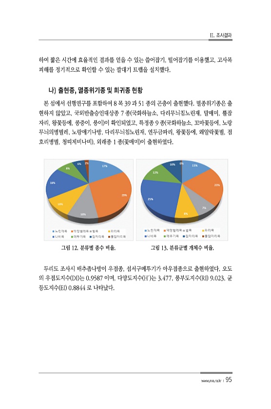 II. 조사결과 www.nie.re.kr ? 95 하여 짧은 시간에 효율적인 결과를 얻을 수 있는 쓸어잡기, 털어잡기를 이용했고, 고사목 피해를 정기적으로 확인할 수 있는 깔대기 트랩을 설치했다. , 본 섬에서 선행연구를 포함하여 8 목 39 과 51 종의 곤충이 출현했다. 멸종위기종은 출 현하지 않았고, 국외반출승인대상종 7 종 국화하늘소, 다리무늬침노린재, 말매미, 뿔잠 자리, 왕꽃등에, 콩중이, 풍이 이 확인되었고, 특정종 9 종 국화하늘소, 꼬마꽃등에, 노랑 무늬의병벌레, 노랑애기나방, 다리무늬침노린재, 연두금파리, 왕꽃등에, 왜알락꽃벌, 점 호리병벌, 청띠제비나비 , 외래종 1 종 꽃매미 이 출현하였다. 그림 12. 분류별 종수 비율. 그림 13. 분류군별 개체수 비율. 두리도 조사시 배추좀나방이 ...