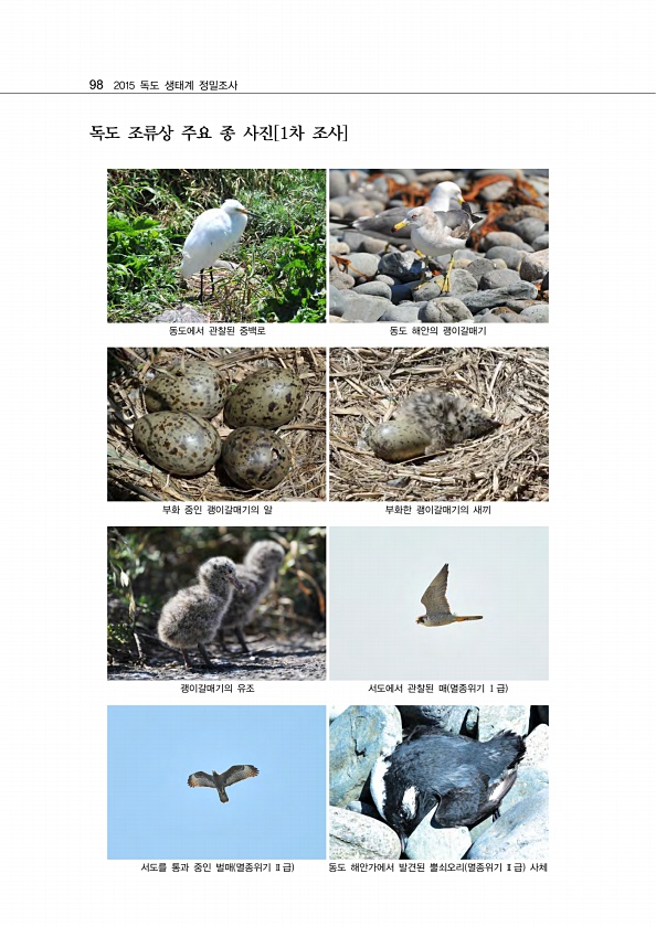 98 2015 독도 생태계 정밀조사 독도 조류상 주요 종 사진[1차 조사] 동도에서 관찰된 중백로 동도 해안의 괭이갈매기 부화 중인 괭이갈매기의 알 부화한 괭이갈매기의 새끼 괭이갈매기의 유조 서도에서 관찰된 매 멸종위기 Ⅰ급 서도를 통과 중인 벌매 멸종위기 Ⅱ급 동도 해안가에서 발견된 뿔쇠오리 멸종위기 Ⅱ급사체