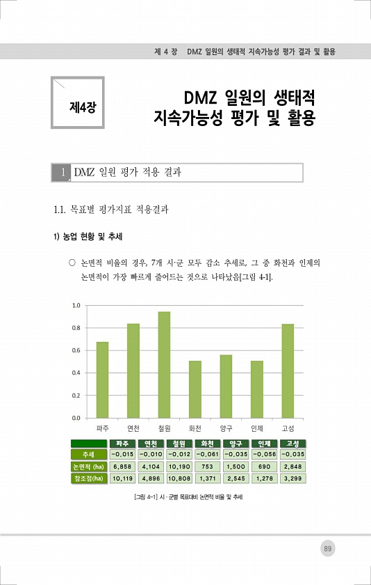 89 제 4 장 DMZ 일원의 생태적 지속가능성 평가 결과 및 활용 DMZ 일원의 생태적 제4장 지속가능성 평가 및 활용 1 DMZ 일원 평가 적용 결과 1.1. 목표별 평가지표 적용결과 1 농업 현황 및 추세 ○ 논면적 비율의 경우, 7개 시·군 모두 감소 추세로, 그 중 화천과 인제의 논면적이 가장 빠르게 줄어드는 것으로 나타났음[그림 4-1]. [그림 4-1] 시·군별 목표대비 논면적 비율 및추세