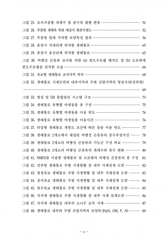 ix x 그림 25. 조사지점별 개체수 및 종수의 월별 변동 그림 26. 추풍령 생태축 복원 대상지 현존식생도 그림 27. 추풍령 일대 지역별 토양특성 결과 그림 28. 춘천시 지내리에 위치한 생태통로 그림 29. 춘천시 용산리에 위치한 생태통로 그림 30. 비행성 곤충류 조사를 위한 a 윈도우트랩 배치도 및 b 도로변에 윈도우트랩을 설치한 모습 그림 31. 육교형 생태통로 조사지역 위치 그림 32. 생태통로 식재도면과 내부지역과 주변 산림지역의 영상사진 진부령 그림 33. 영상 및 DB 통합관리 시스템 구조 그림 34. 생태통로 유형별 야생동물 종 구성 그림 35. 생태통로 유형별 야생동물 이용 빈도 그림 36. 생태통로 유형별 야생동물 이용시간 그림 37. 터널형 생태통로 개방도 조건에 따른 동물 이용 ...