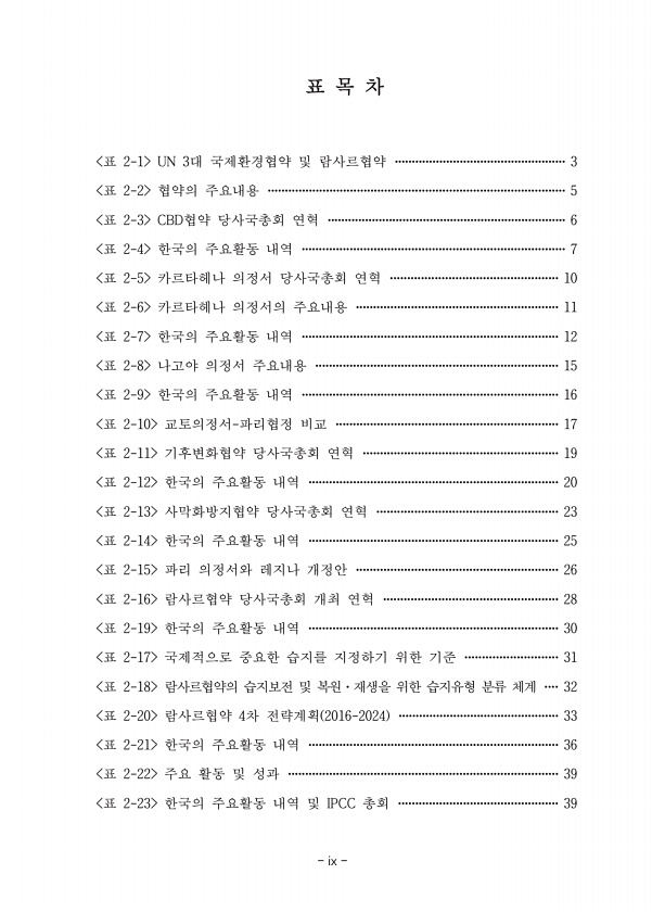 ix 표 목 차 표 2-1 UN 3대 국제환경협약 및 람사르협약 ··················································3 표 2-2 협약의 주요내용 ·······················································································5 표 2-3 CBD협약 당사국총회 연혁 ······································································6 표 2-4 한국의 주요활동 내역 ·············································································7 표 2-5 카르타헤나 의정서 당사...