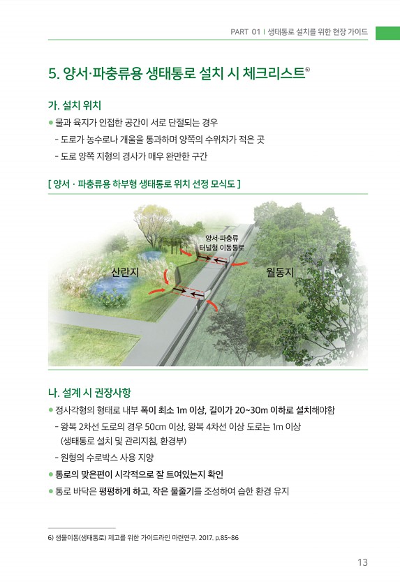 13 PART 01 생태통로 설치를 위한 현장 가이드 5. 양서·파충류용 생태통로 설치 시 체크리스트6 가. 설치 위치? 물과 육지가 인접한 공간이 서로 단절되는 경우?도로가 농수로나 개울을 통과하며 양쪽의 수위차가 적은 곳?도로 양쪽 지형의 경사가 매우 완만한 구간 [ 양서·파충류용 하부형 생태통로 위치 선정 모식도 ] 산란지 월동지 양서·파충류 터널형 이동통로 나. 설계 시 권장사항? 정사각형의 형태로 내부 폭이 최소 1m 이상, 길이가 2030m 이하로 설치해야함?왕복 2차선 도로의 경우 50cm 이상, 왕복 4차선 이상 도로는 1m 이상? 생태통로 설치 및 관리지침, 환경부?원형의 수로박스 사용 지양? 통로의 맞은편이 시각적으로 잘 트여있는지 확인? 통로 바닥은 평평하게 하고, 작은 물줄기를 조성하여...