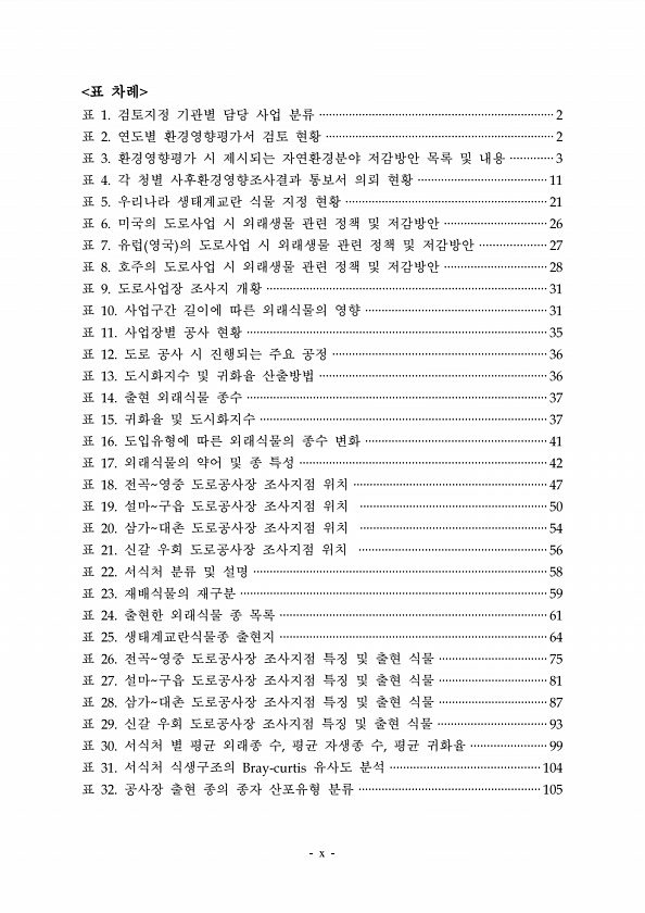 표 차례 표 검토지정 기관별 담당 사업 분류 표 연도별 환경영향평가서 검토 현황 표 환경영향평가 시 제시되는 자연환경분야 저감방안 목록 및 내용 표 각 청별 사후환경영향조사결과 통보서 의뢰 현황 표 우리나라 생태계교란 식물 지정 현황 표 미국의 도로사업 시 외래생물 관련 정책 및 저감방안 표 유럽 영국 의 도로사업 시 외래생물 관련 정책 및 저감방안 표 호주의 도로사업 시 외래생물 관련 정책 및 저감방안 표 도로사업장 조사지 개황 표 사업구간 길이에 따른 외래식물의 영향 표 사업장별 공사 현황 표 도로 공사 시 진행되는 주요 공정 표 도시화지수 및 귀화율 산출방법 표 출현 외래식물 종수 표 귀화율 및 도시화지수 표 도입유형에 따른 외래식물의 종수 변화 표 외래식물의 약어 및 종 특성 표 전곡 영중 도로공사장...