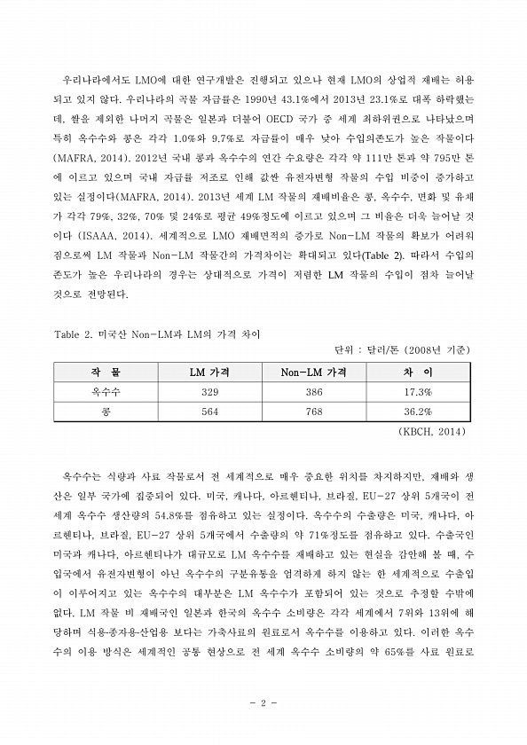 2 우리나라에서도 LMO에 대한 연구개발은 진행되고 있으나 현재 LMO의 상업적 재배는 허용 되고 있지 않다. 우리나라의 곡물 자급률은 1990년 43.1%에서 2013년 23.1%로 대폭 하락했는 데, 쌀을 제외한 나머지 곡물은 일본과 더불어 OECD 국가 중 세계 최하위권으로 나타났으며 특히 옥수수와 콩은 각각 1.0%와 9.7%로 자급률이 매우 낮아 수입의존도가 높은 작물이다 MAFRA, 2014 2012년 국내 콩과 옥수수의 연간 수요량은 각각 약 111만 톤과 약 795만 톤 에 이르고 있으며 국내 자급률 저조로 인해 값싼 유전자변형 작물의 수입 비중이 증가하고 있는 실정이다 MAFRA, 2014 2013년 세계 LM 작물의 재배비율은 콩, 옥수수, 면화 및 유채 가 각각 79%, 32%, 70% ...