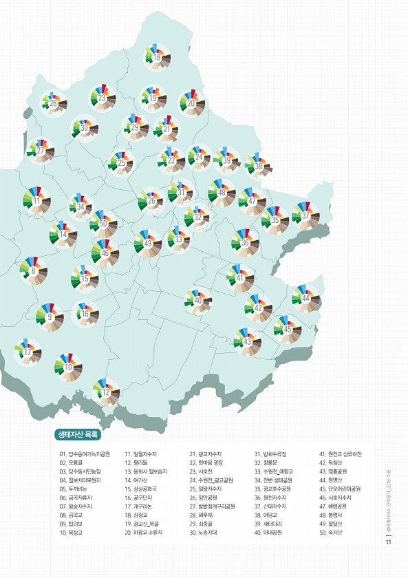 11 17 27 8 28 9 21 31 12 22 32 23 14 33 24 34 15 25 16 26 46 41 42 43 44 35 45 36 37 47 38 48 19 29 39 49 10 20 30 40 50 18 01. 당수동여가녹지공원 02. 오룡골 03. 당수동시민농장 04. 칠보치마복원지 05. 두꺼비논 06. 금곡저류지 07. 왕송저수지 08. 금곡교 09. 탑리보 10. 목장교 11. 일월저수지 12. 평리들 13. 용화사 칠보습지 14. 여기산 15. 상상공화국 16. 공구단지 17. 개구리논 18. 상광교 19. 광교산_북골 20. 하광교 소류지 21. 광교저수지 22. 한마음 광장 23. 서호천 24. 수원천_광교공원 25. 일왕저수지 26. 장안공원 27. 밤밭청개구리공원 28. 해...