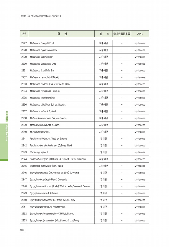 108 번호 학 명 장 소 국가생물종목록 APG 피자식물문 Magnoliophyta Plants List of National Institute Ecology Ⅰ 2227 Melaleuca huegelii Endl. 지중해관 Myrtaceae 2228 Melaleuca hypericifolia Sm. 지중해관 Myrtaceae 2229 Melaleuca incana R.Br. 지중해관 Myrtaceae 2230 Melaleuca lanceolata Otto 지중해관 Myrtaceae 2231 Melaleuca linariifolia Sm. 지중해관 Myrtaceae 2232 Melaleuca nesophila F.Muell. 지중해관 Myrtaceae 2233 Melaleuca nodosa Sol. ex G...
