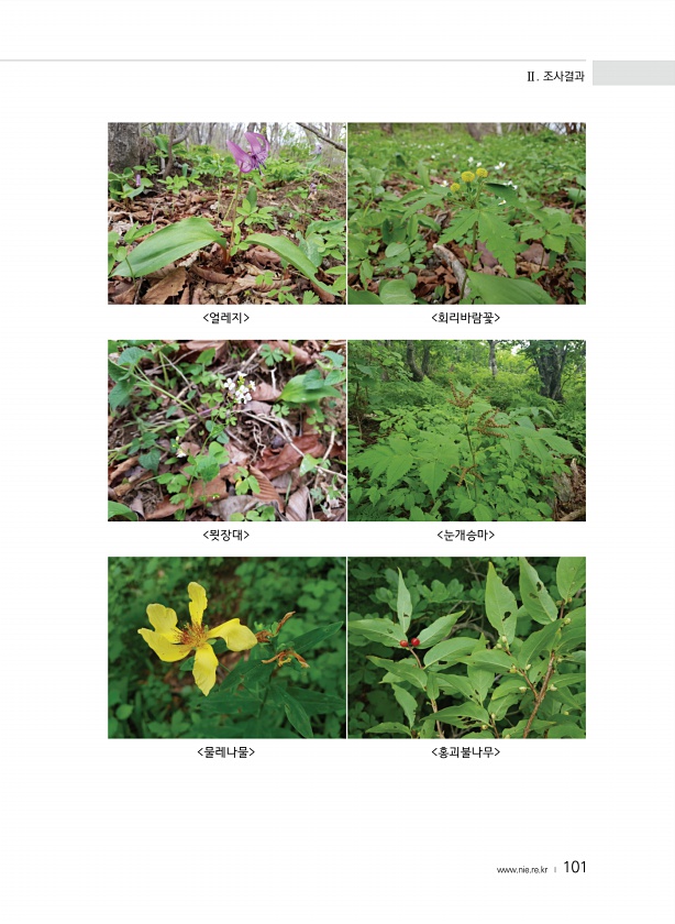 Ⅱ. 조사결과 www.nie.re.kr ? 101 얼레지 회리바람꽃 묏장대 눈개승마 물레나물 홍괴불나무