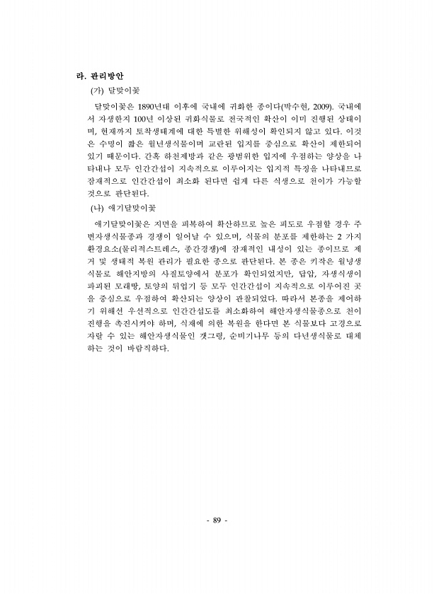 89 라. 관리방안 가 달맞이꽃 달맞이꽃은 1890년대 이후에 국내에 귀화한 종이다 박수현, 2009 국내에 서 자생한지 100년 이상된 귀화식물로 전국적인 확산이 이미 진행된 상태이 며, 현재까지 토착생태계에 대한 특별한 위해성이 확인되지 않고 있다. 이것 은 수명이 짧은 월년생식물이며 교란된 입지를 중심으로 확산이 제한되어 있기 때문이다. 간혹 하천제방과 같은 광범위한 입지에 우점하는 양상을 나 타내나 모두 인간간섭이 지속적으로 이루어지는 입지적 특징을 나타내므로 잠재적으로 인간간섭이 최소화 된다면 쉽게 다른 식생으로 천이가 가능할 것으로 판단된다. 나 애기달맞이꽃 애기달맞이꽃은 지면을 피복하여 확산하므로 높은 피도로 우점할 경우 주 변자생식물종과 경쟁이 일어날 수 있으며, 식물의 분포를 제한하는 2 가...