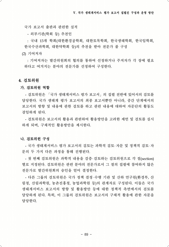Ⅴ. 국가 생태계서비스 평가 보고서 집필진 구성과 운영 방안 89 국가 보고서 출판과 관련한 실적 외부기관 학회 등 추천인 국내 13개 학회 대한환경공학회, 대한토목학회, 한국생태학회, 한국임학회, 한국수산과학회, 대한약학회 등 의 추천을 받아 전문가 풀 구성 2 기여저자 기여저자는 발간위원회의 협의를 통하여 선정하거나 주저자가 각 장에 필요 하다고 여겨지는 분야의 전문가를 선정하여 구성한다. 4. 검토위원 가. 검토위원 역할 검토위원은 「국가 생태계서비스 평가 보고서」의 집필 전반에 있어서의 검토를 담당한다. 국가 생태계 평가 보고서의 최종 보고서뿐만 아니라, 중간 단계에서의 보고서의 방향 및 내용에 관한 검토를 하고 관련 내용에 대하여 자문단의 활동도 겸임하게 된다. 검토위원은 보고서의 활용과 관련하여 ...