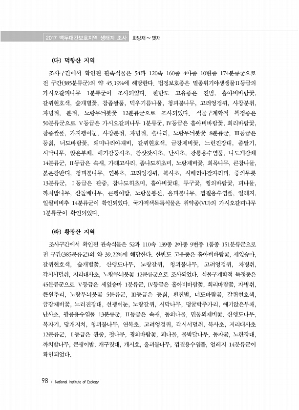 2017 백두대간보호지역 생태계 조사 화방재 댓재 98 ? National Institute of Ecology 다 덕항산 지역 조사구간에서 확인된 관속식물은 54과 120속 160종 4아종 10변종 174분류군으로 전 구간 385분류군 의 약 45.19%에 해당한다. 법정보호종은 멸종위기야생생물Ⅱ등급의 가시오갈피나무 1분류군이 조사되었다. 한반도 고유종은 진범, 홀아비바람꽃, 갈퀴현호색, 숲개별꽃, 참좁쌀풀, 덕우기름나물, 청괴불나무, 고려엉겅퀴, 사창분취, 자병취, 분취, 노랑무늬붓꽃 12분류군으로 조사되었다. 식물구계학적 특정종은 50분류군으로 Ⅴ등급은 가시오갈피나무 1분류군, Ⅳ등급은 홀아비바람꽃, 회리바람꽃, 참좁쌀풀, 가지괭이눈, 사창분취, 자병취, 솔나리, 노랑무늬붓꽃 8분류군, Ⅲ등급은 등칡,...
