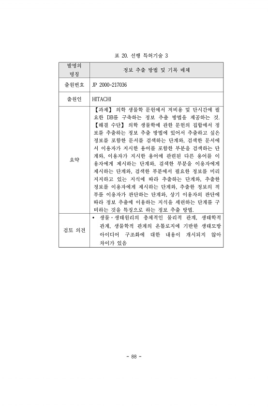 88 발명의 명칭 정보 추출 방법 및 기록 매체 출원번호 JP 2000-217036 출원인 HITACHI 요약 【과제】 의학 생물학 문헌에서 저비용 및 단시간에 필 요한 DB를 구축하는 정보 추출 방법을 제공하는 것. 【해결 수단】 의학 생물학에 관한 문헌의 집합에서 정 보를 추출하는 정보 추출 방법에 있어서 추출하고 싶은 정보를 포함한 문서를 검색하는 단계와, 검색한 문서에 서 이용자가 지시한 용어를 포함한 부분을 검색하는 단 계와, 이용자가 지시한 용어에 관련된 다른 용어를 이 용자에게 제시하는 단계와, 검색한 부분을 이용자에게 제시하는 단계와, 검색한 부분에서 필요한 정보를 미리 지지하고 있는 지식에 따라 추출하는 단계와, 추출한 정보를 이용자에게 제시하는 단계와, 추출한 정보의 적 부를 이용자가 판단...