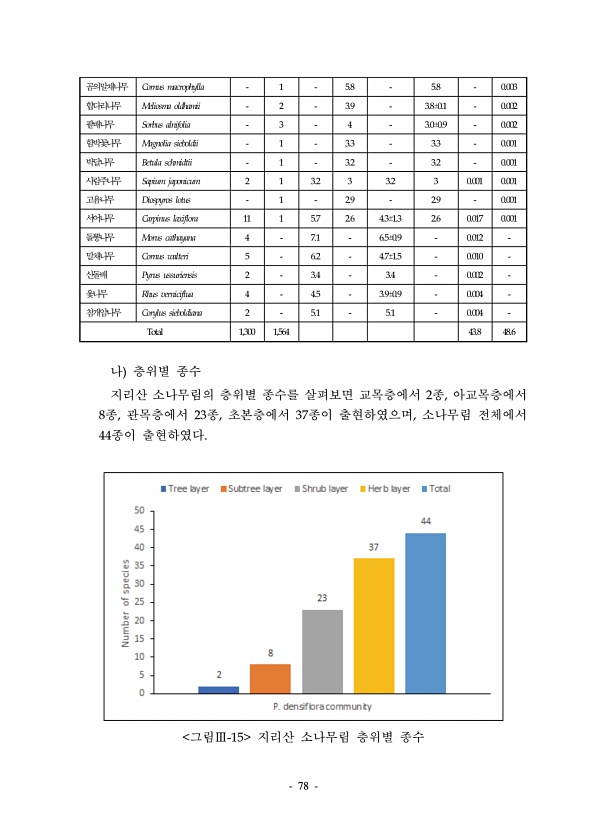 78 곰의말채나무 Cornus macrophylla 1 5.8 5.8 0.003 합다리나무 Meliosma oldhamii 2 3.9 3.8±0.1 0.002 팥배나무 Sorbus alnifolia 3 4 3.0±0.9 0.002 함박꽃나무 Magnolia sieboldii 1 3.3 3.3 0.001 박달나무 Betula schmidtii 1 3.2 3.2 0.001 사람주나무 Sapium japonicum 2 1 3.2 3 3.2 3 0.001 0.001 고욤나무 Diospyros lotus 1 2.9 2.9 0.001 서어나무 Carpinus laxiflora 11 1 5.7 2.6 4.3±1.3 2.6 0.017 0.001 돌뽕나무 Morus cathayana 4 7.1 6.5±0.9 0.012 말채...
